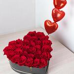 heart box - 1 pcs red roses - 35 pcs red heart foil balloons - 3 pcs
