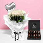 Indulge in the perfect blend of elegance and sweetness with this exquisite gift set. A stunning bouquet of fresh white roses, delicately wrapped in luxurious white paper and adorned with a silver heart-shaped balloon, radiates pure sophistication. The fresh blooms are complemented by a premium box of artisan chocolates, each piece crafted to delight your senses with rich, decadent flavors. Perfect for anniversaries, birthdays, or any romantic occasion, this set captures both beauty and taste in one unforgettable gesture. The sleek black packaging from Casa Flora adds a touch of modern luxury, making it as visually captivating as it is delicious. Surprise someone special with this harmonious combination of floral charm and gourmet indulgence.