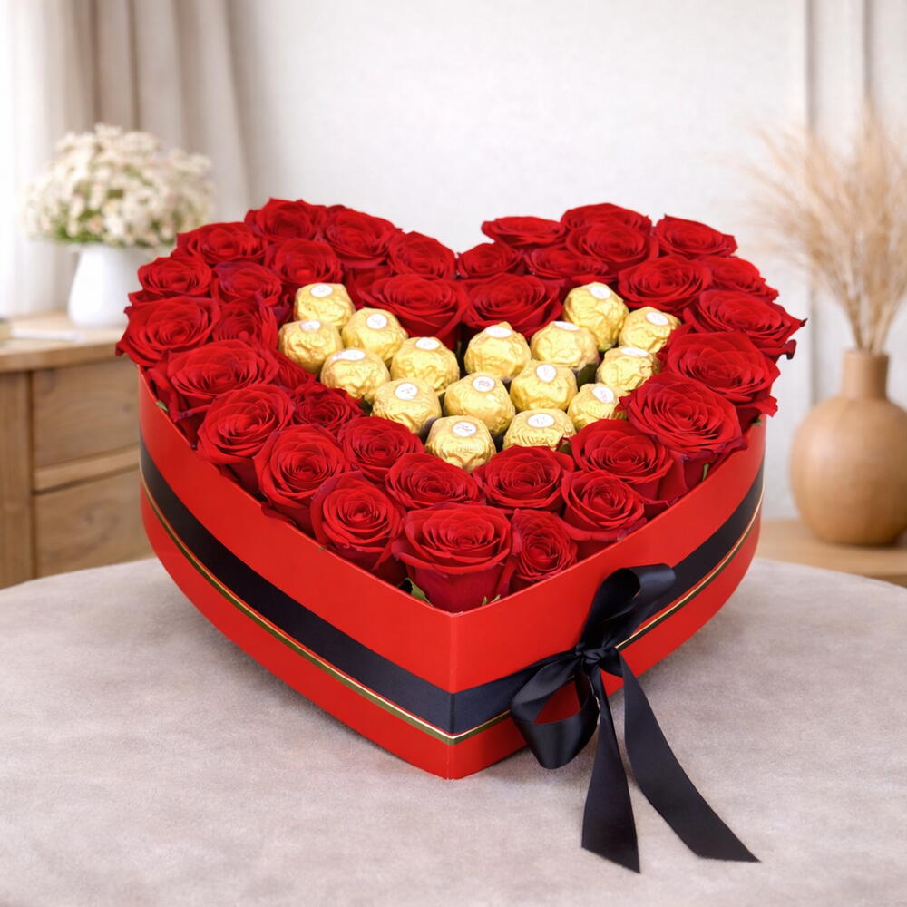 Combo Includes Flower Type: Fresh Red Roses Rose Count: 35 Stems Chocolate: Ferrero Rocher (14 Pieces) Box Type: Red Heart Shape Premium Box Ribbon: Black Satin Bow Arrangement Type: Flower Chocolate Combo Box Product Description This luxurious flower and chocolate combo features 35 fresh red roses beautifully arranged in a premium red heart-shaped box and paired with 14 pieces of Ferrero Rocher chocolates for an irresistible sweet touch. Finished with a stylish black satin bow, this handcrafted arrangement is perfect for expressing love and affection. Ideal for Valentine’s Day, anniversaries, proposals, birthdays, and romantic surprises, this elegant combo box is designed to make every special moment unforgettable.