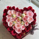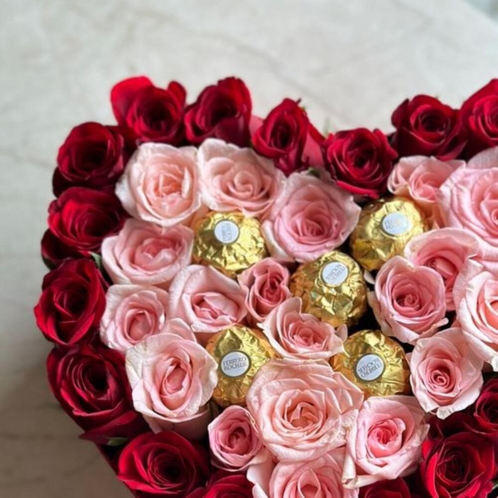 heart box - 1 pcs red roses - 21 pcs pink roses - 21 pcs rocher chocolate - 5 pcs