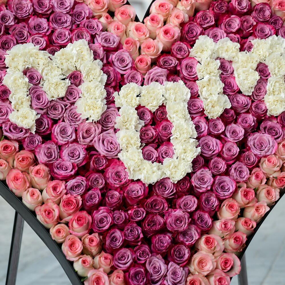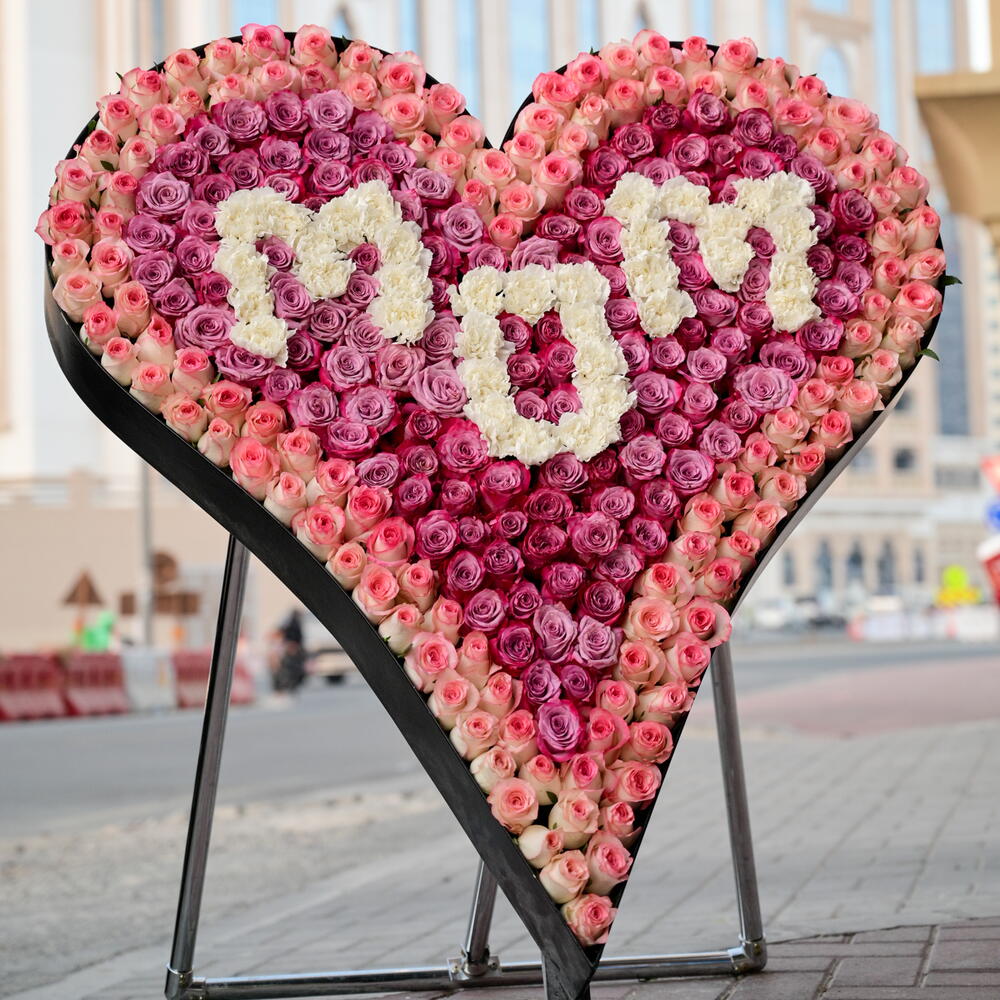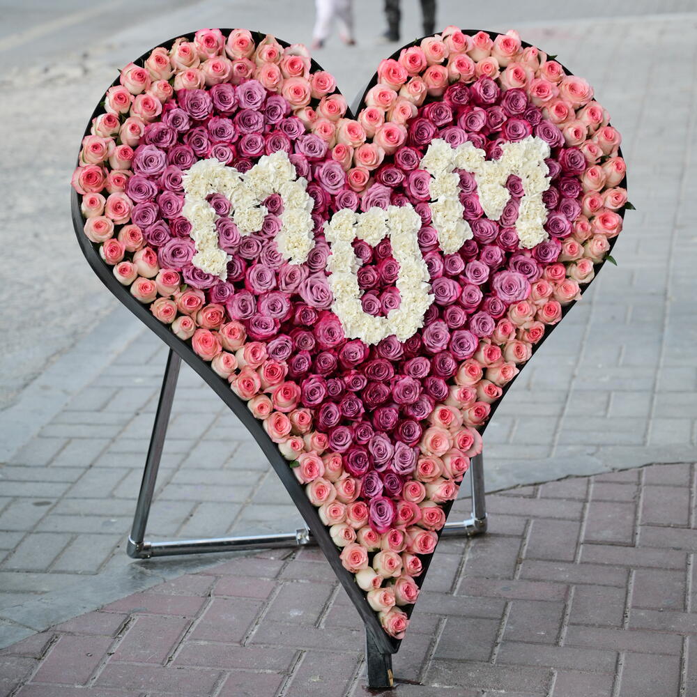 Celebrate your love and appreciation with this beautiful heart-shaped floral arrangement, featuring 269 mixed Jumilia and purple roses, along with 39 white carnations. The delicate arrangement spells out MOM in a stunning floral design, making it the perfect gift for Mothers Day or any occasion to honor your mom. Available exclusively at Fellora Flower Boutique.