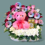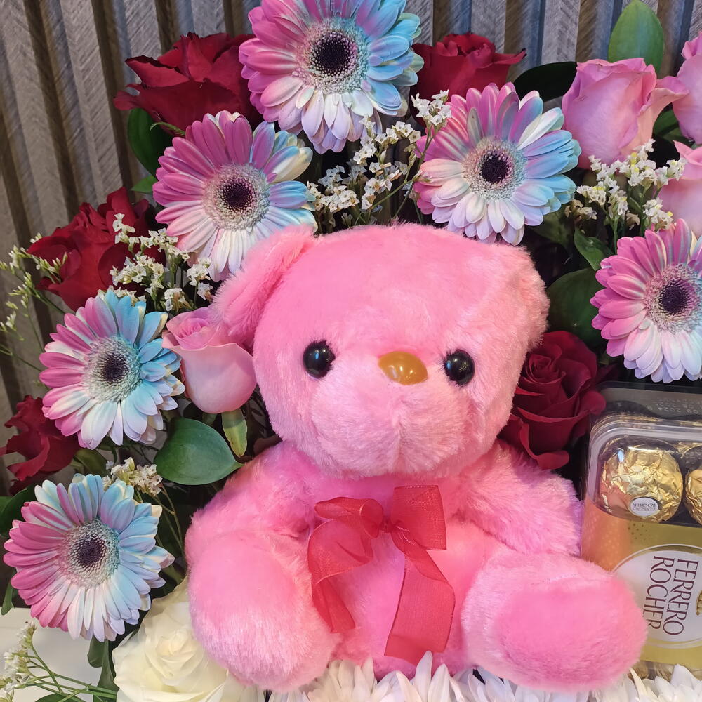 A delightful arrangement featuring a plush pink teddy bear nestled among vibrant roses, uniquely colored daisies, and white chrysanthemums, accompanied by Ferrero Rocher chocolates, all presented in a charming basket, perfect for a heartfelt gift.