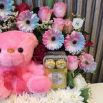Limonium - 1 pcs Gerbera - 7 pcs teddy bear 20cm - 1 pcs roses - 13 pcs ruscuss - 10 pcs crazantimo - 3 pcs ferrero rocher 16 pcs chocolates box - 1 pcs