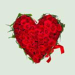 A classic and luxurious heart-shaped arrangement, overflowing with dozens of vibrant, dew-kissed red roses. Framed by lush green foliage and adorned with a flowing red ribbon, this stunning display is the quintessential symbol of deep love and devotion. (this arrangement has heart shaped sponge with covered wrap)
