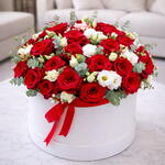Romantic, charming, and beautifully balanced — Hearts Roses Delight is designed to make hearts flutter. This hand-crafted bouquet features 40–45 luxurious red roses, paired with 15 delicate white lisianthus and fresh eucalyptus foliage, creating a soft yet striking contrast of passion and elegance.