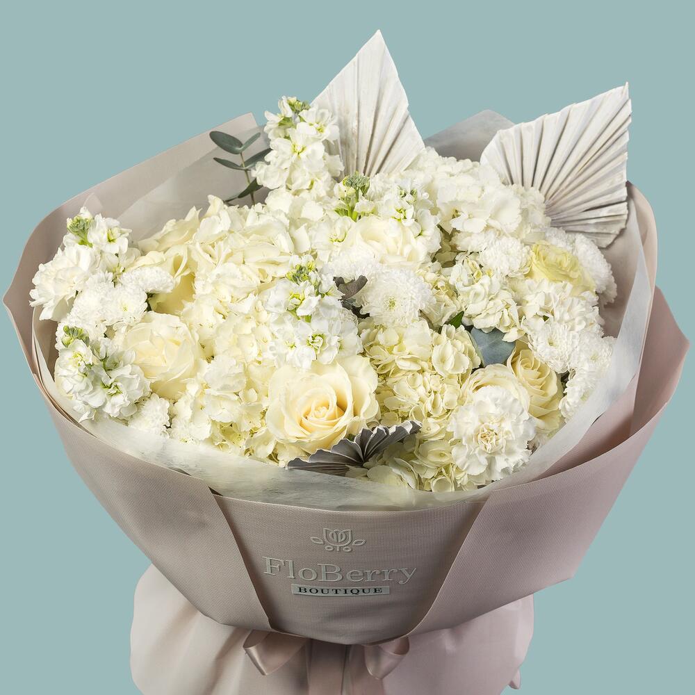 Hydrangea - 5 pcs Wrapping - 1 pcs carnation - 5 pcs matthiola - 5 pcs chrysanthemum spray - 5 pcs dried palm spear - 3 pcs blad pistacia - 3 pcs rose mondial 50 ecu - 7 pcs