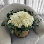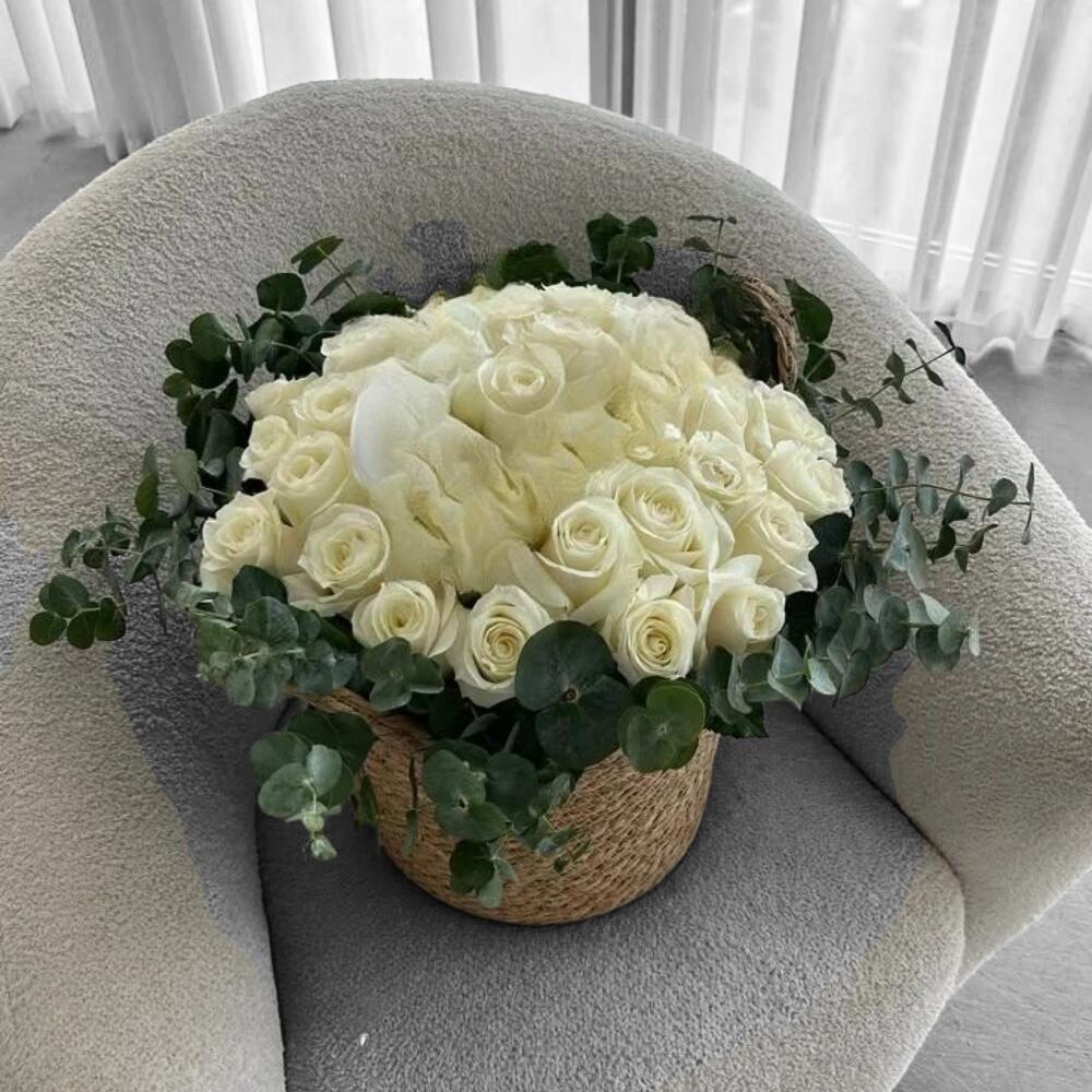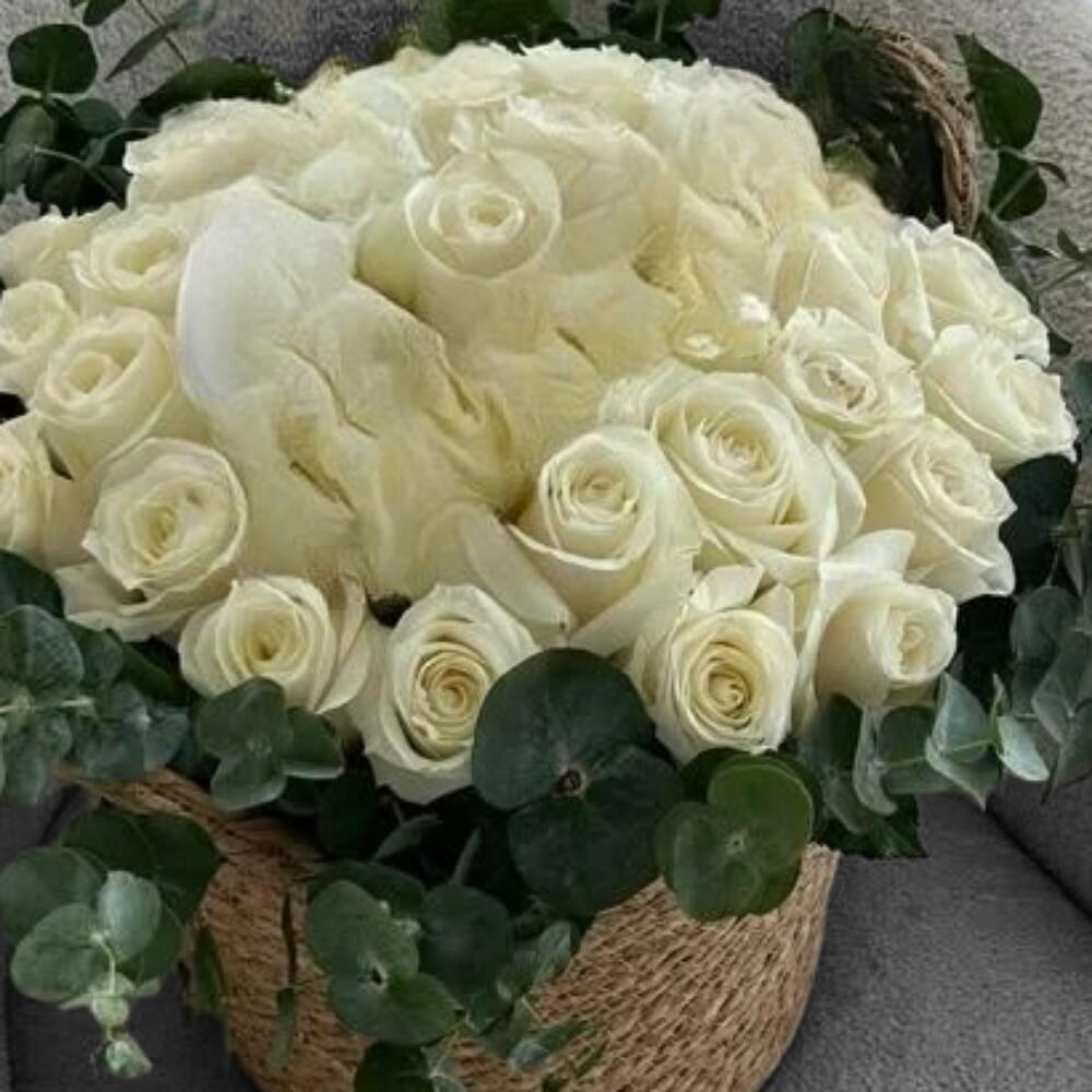 - *White Roses* – Classic symbols of purity, innocence, and elegance. - *Eucalyptus Leaves* – Add texture and a refreshing scent, symbolizing protection and healing. *Description:* This is a soft, elegant floral arrangement featuring white roses and white hydrangeas, surrounded by lush eucalyptus foliage. Presented in a rustic woven basket, it exudes a clean, modern, and natural charm. Ideal for weddings, sympathy, or refined home décor.