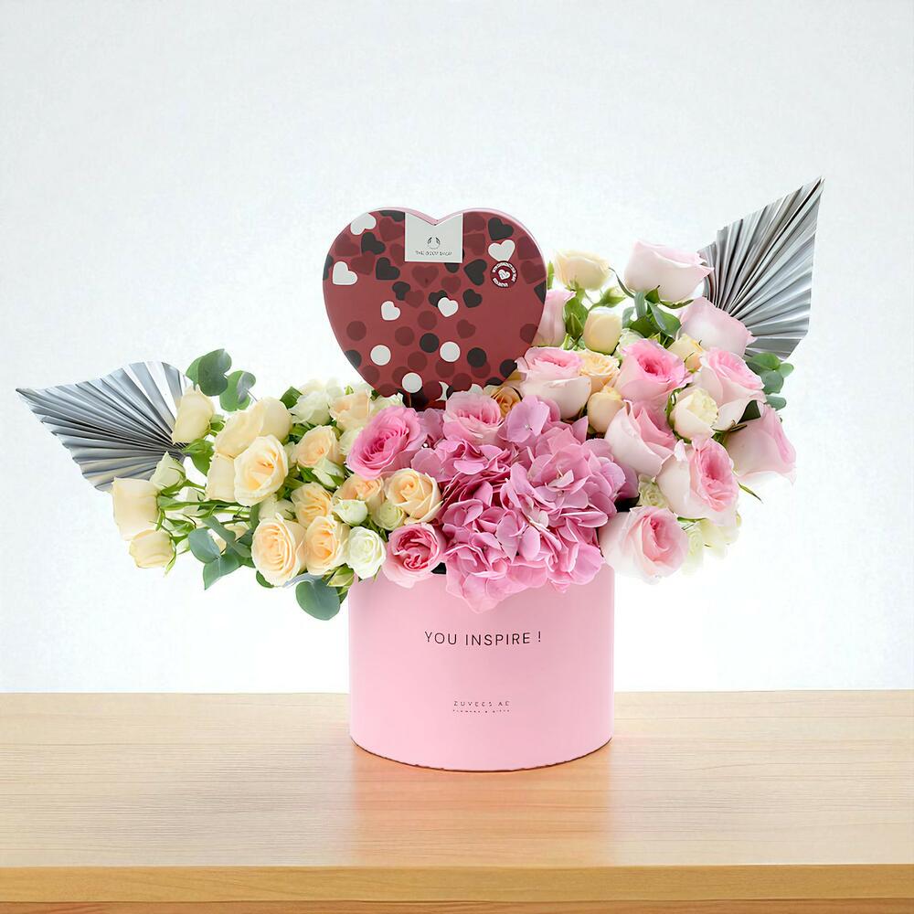 Unveil the Heirloom in Bloom Heart Gift Box Combo, a heartfelt symphony of floral elegance and cherished keepsakes, crafted to honor the timeless grace of Emirati women. Inspired by the 2025 theme Hand in Hand, We Celebrate 50 Years, this luxurious Dubai gift set blends vibrant blooms with a heart-themed gift box, presented in a pink Zuvees luxury box inscribed with YOU INSPIRE, symbolizing unity, strength, and refined devotion. with a heart-shaped box filled with The Body Shop’s sweetest strawberry-scented delights, including lip butter, body butter, and hand cream