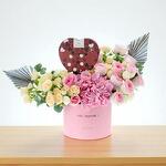 pink hydrangea - 1 pcs eucalyptus stems - 3 pcs pink roses - 13 pcs white spray roses - 7 pcs peach spray roses - 7 pcs hand-painted dry leaves - 2 pcs box with the body shop’s - 1 pcs