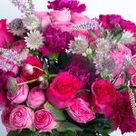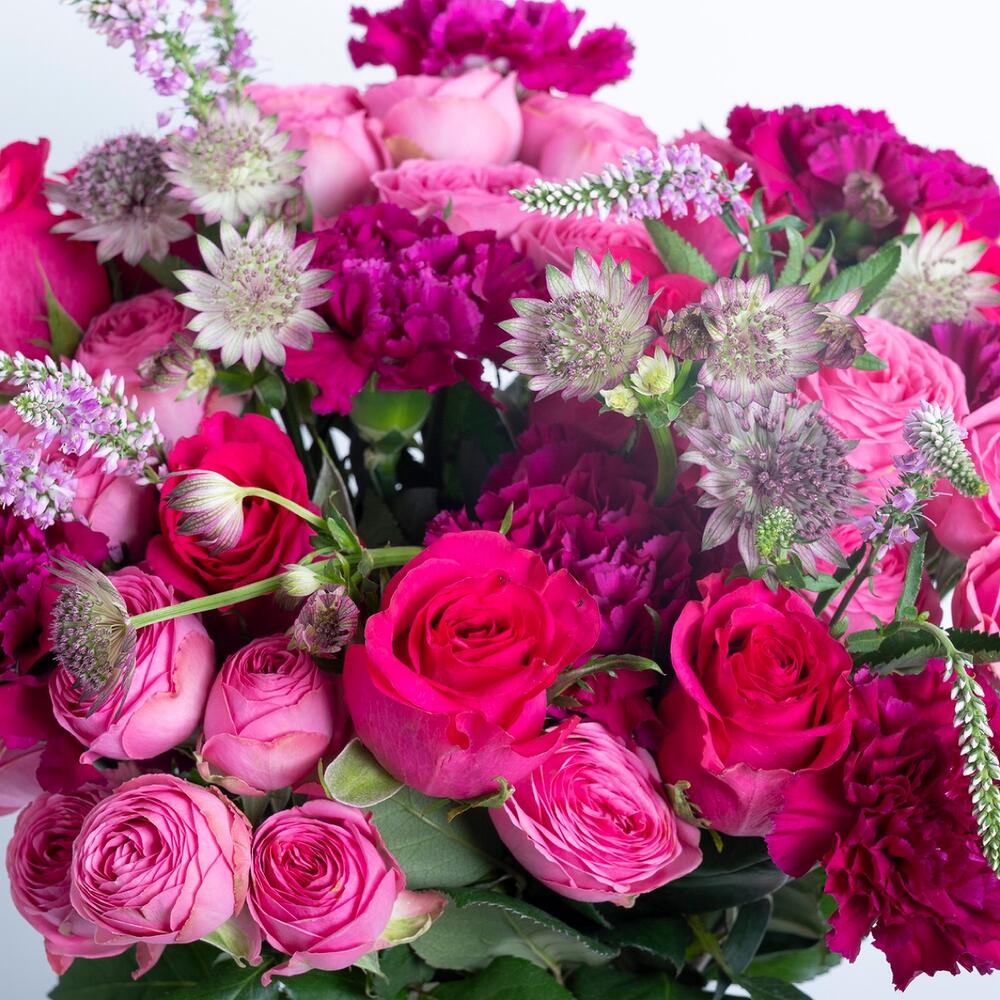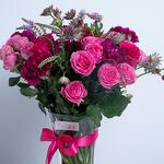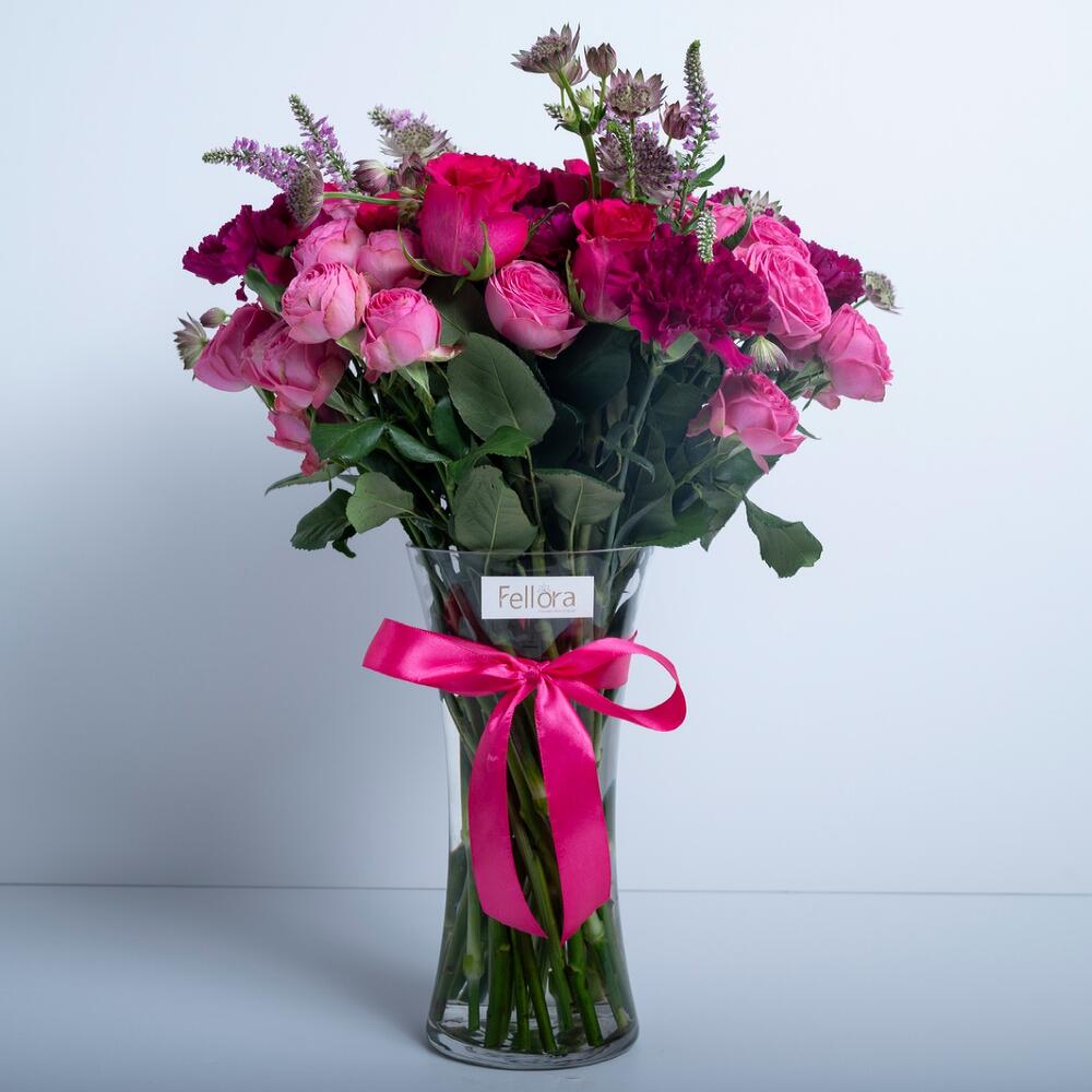 Veronica - 9 pcs Ribbon - 1 pcs Astrantia - 3 pcs rose - 10 pcs carnation - 7 pcs cylinder vase - 1 pcs premium spray rose - 5 pcs