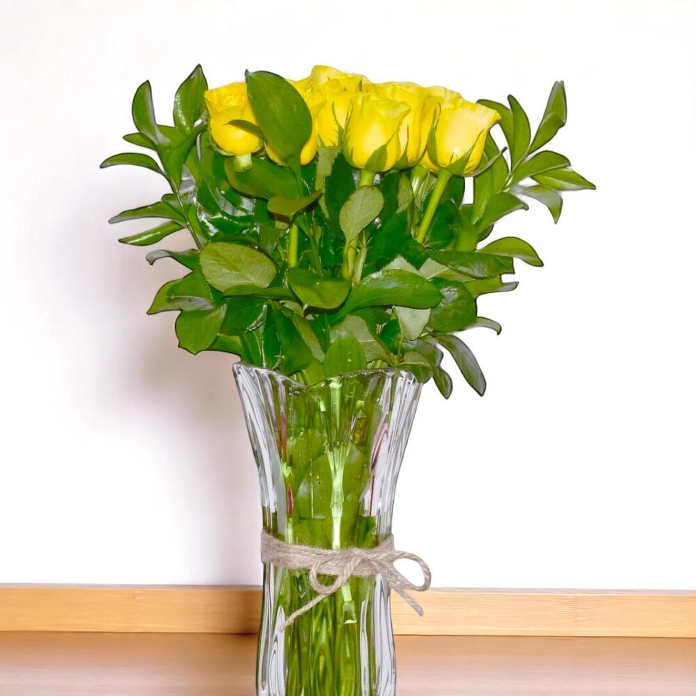 Brighten any moment with the Sunny Yellow Rose Bouquet, a cheerful and elegant floral arrangement designed to spread happiness and warmth. Featuring 20 vibrant yellow roses carefully arranged in a stylish crystal-clear glass vase, this bouquet symbolizes friendship, joy, and positive energy. Accented with lush greenery, it brings a fresh, radiant charm to any space. Perfect for birthdays, thank you gifts, get well wishes, or to simply uplift someone’s day. Its timeless beauty and vibrant color make it a versatile gift for any occasion. Care Recommendations: To maintain the beauty and freshness of your Sunny Yellow Rose Bouquet, change the water daily and trim the stems at an angle to allow better water absorption. Place the arrangement in a cool area, away from direct sunlight, heaters, or cold drafts. Remove any leaves that may fall below the waterline to prevent bacterial buildup. With regular care, your yellow roses will stay fresh and vibrant for up to a week or more, bringing lasting joy.