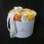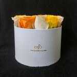 Glamorous mix of yellow, white, and orange roses in a luxurious white hatbox
