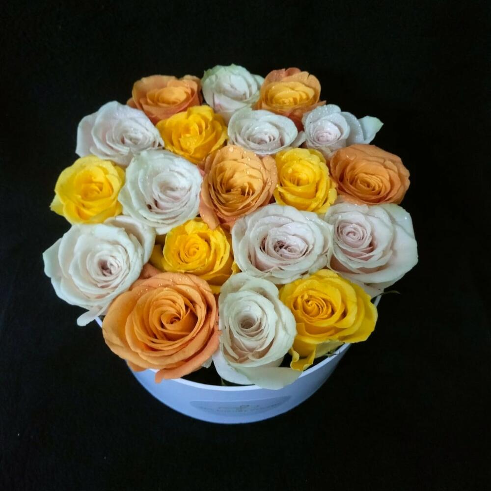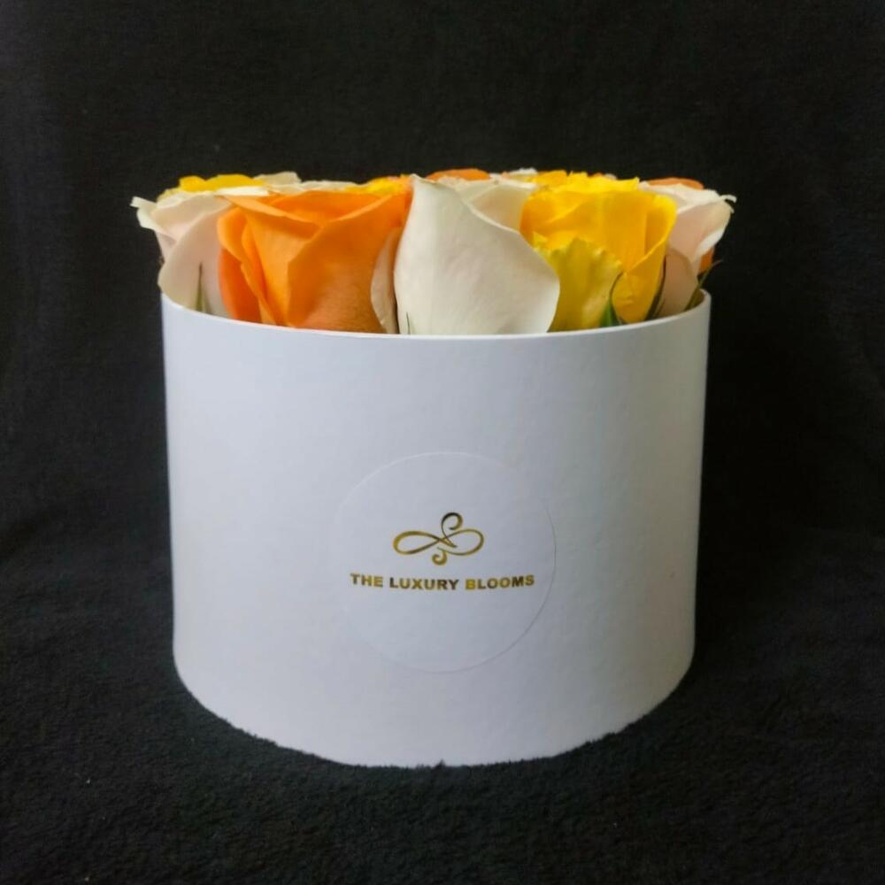 large flower box - 1 pcs atlas ribbon - 1 pcs mix of white - 8 pcs yellow and orange rose - 9 pcs