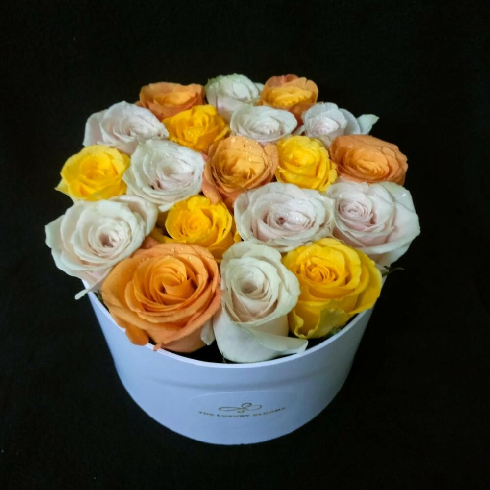 Glamorous mix of yellow, white, and orange roses in a luxurious white hatbox