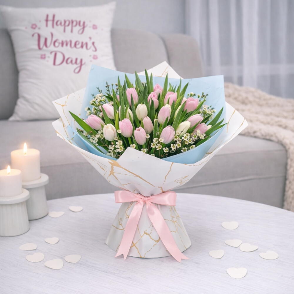 Des - Beautiful Bouquet of 35 Pink and White Tulips in a Blue and White Marble wrapping decorated with White wax and tied with a Pink ribbon Bow.