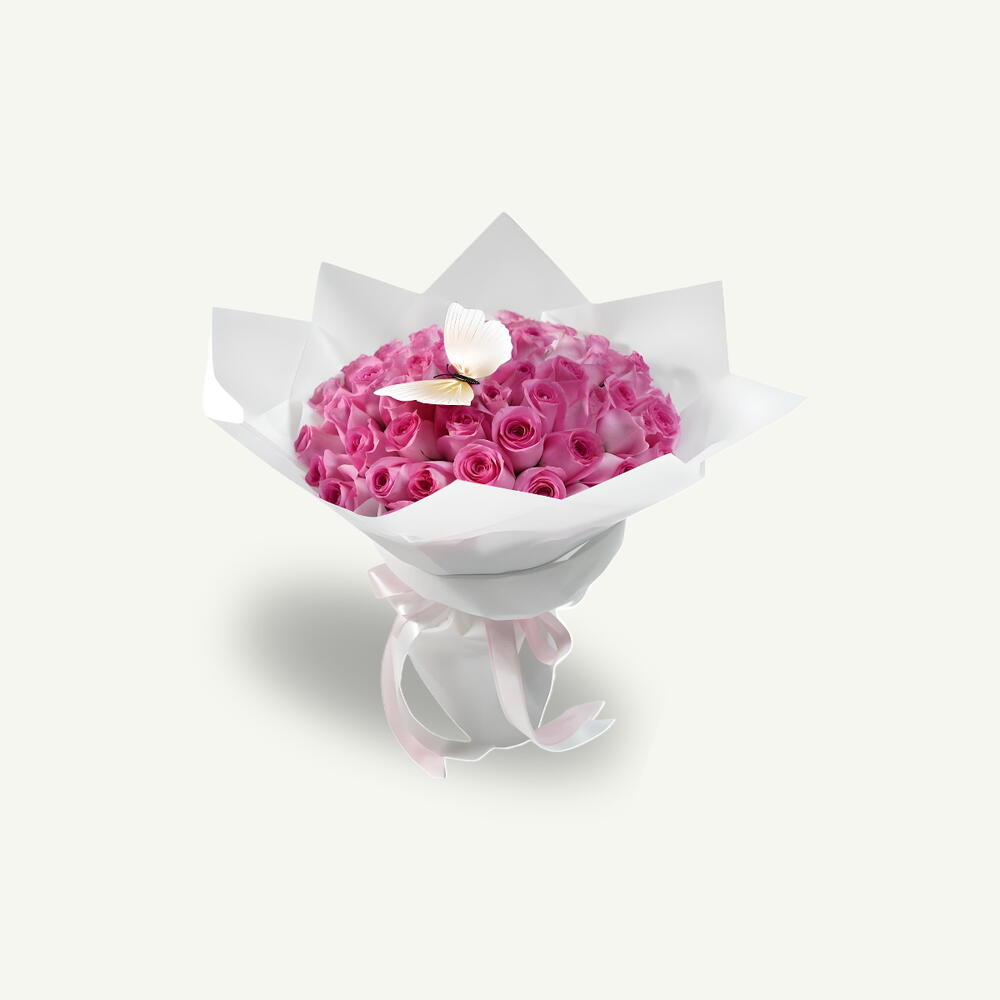 A gracefully hand-tied bouquet of 55 delicate pink roses, adorned with a charming butterfly accent, elegantly wrapped in pristine white for a timeless and heartfelt touch.