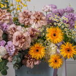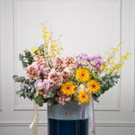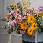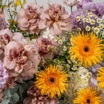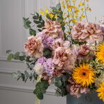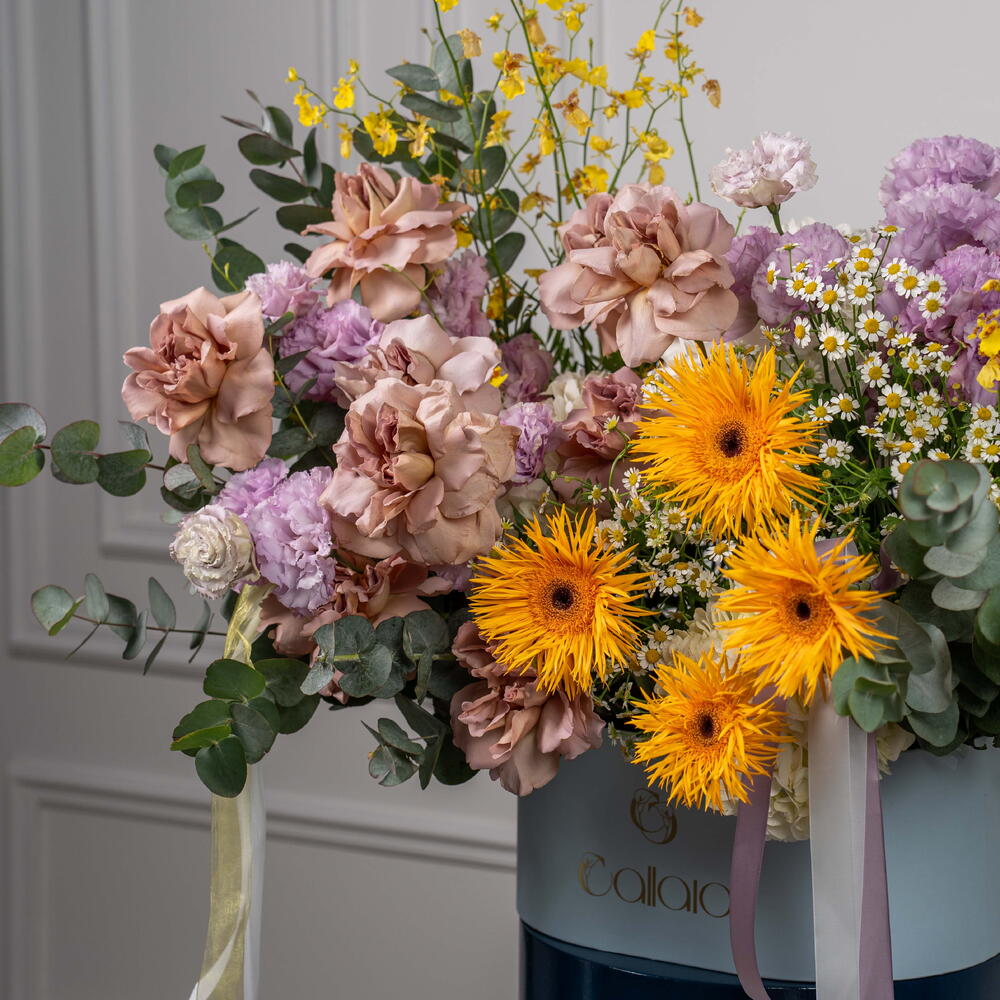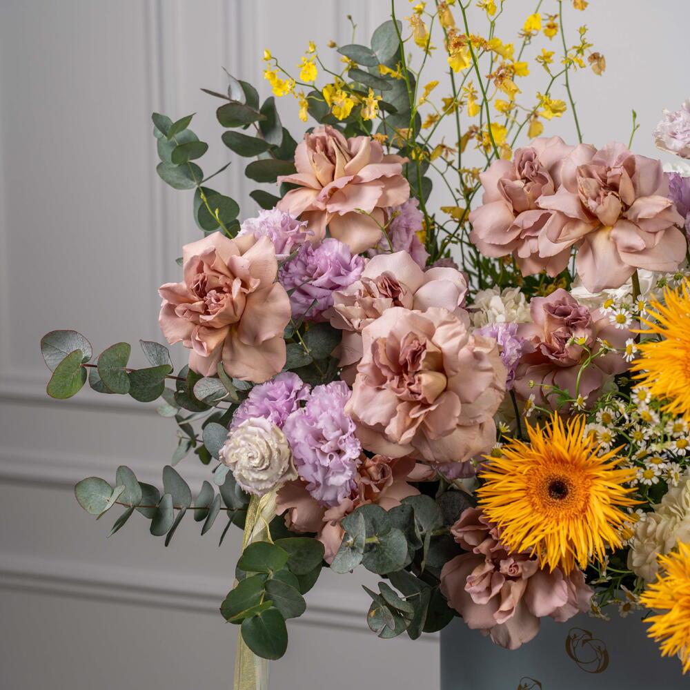 Eucalyptus - 7 pcs hydrangea white - 3 pcs tanacetum - 5 pcs eustoma purple - 7 pcs oncidium yellow - 6 pcs rose cafe latte - 9 pcs gerbera spider dust - 4 pcs