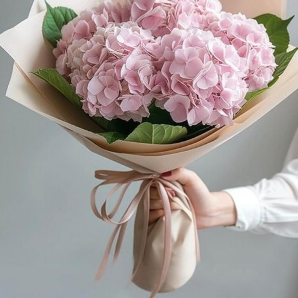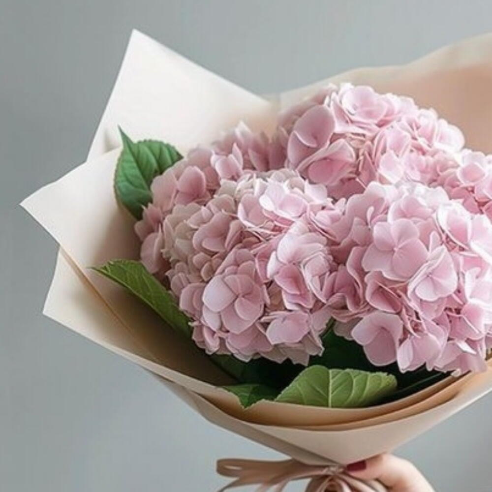 This delicate bouquet exudes elegance and grace with its soft pink hydrangea blooms. Wrapped in a neutral-toned paper and finished with a matching satin ribbon, it’s a refined choice for birthdays, thank-yous, or simply to uplift someones day. The gentle pastel tones evoke calm and tenderness, making it a charming accent in any setting. Keep the bouquet fresh by placing it in clean water, trimming the stems diagonally every few days, and avoiding direct sunlight or drafts.