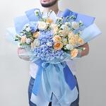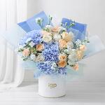 That tranquil feeling of gazing at the clear blue sky, captured in a splendid assortment of hydrangea, roses and carnations. Its blend of blue hues and neutral tones makes it a quintessential gift that exudes serenity.