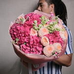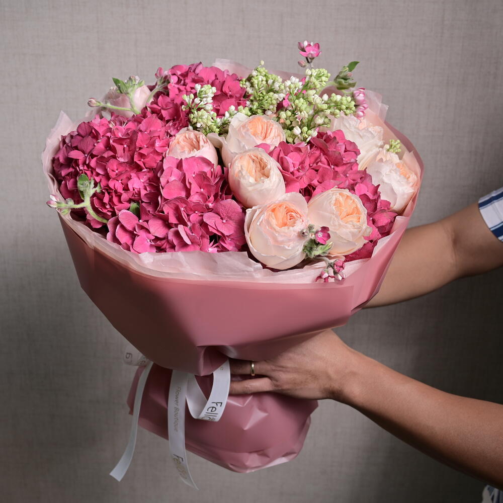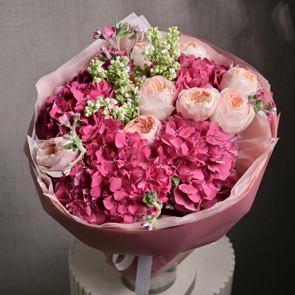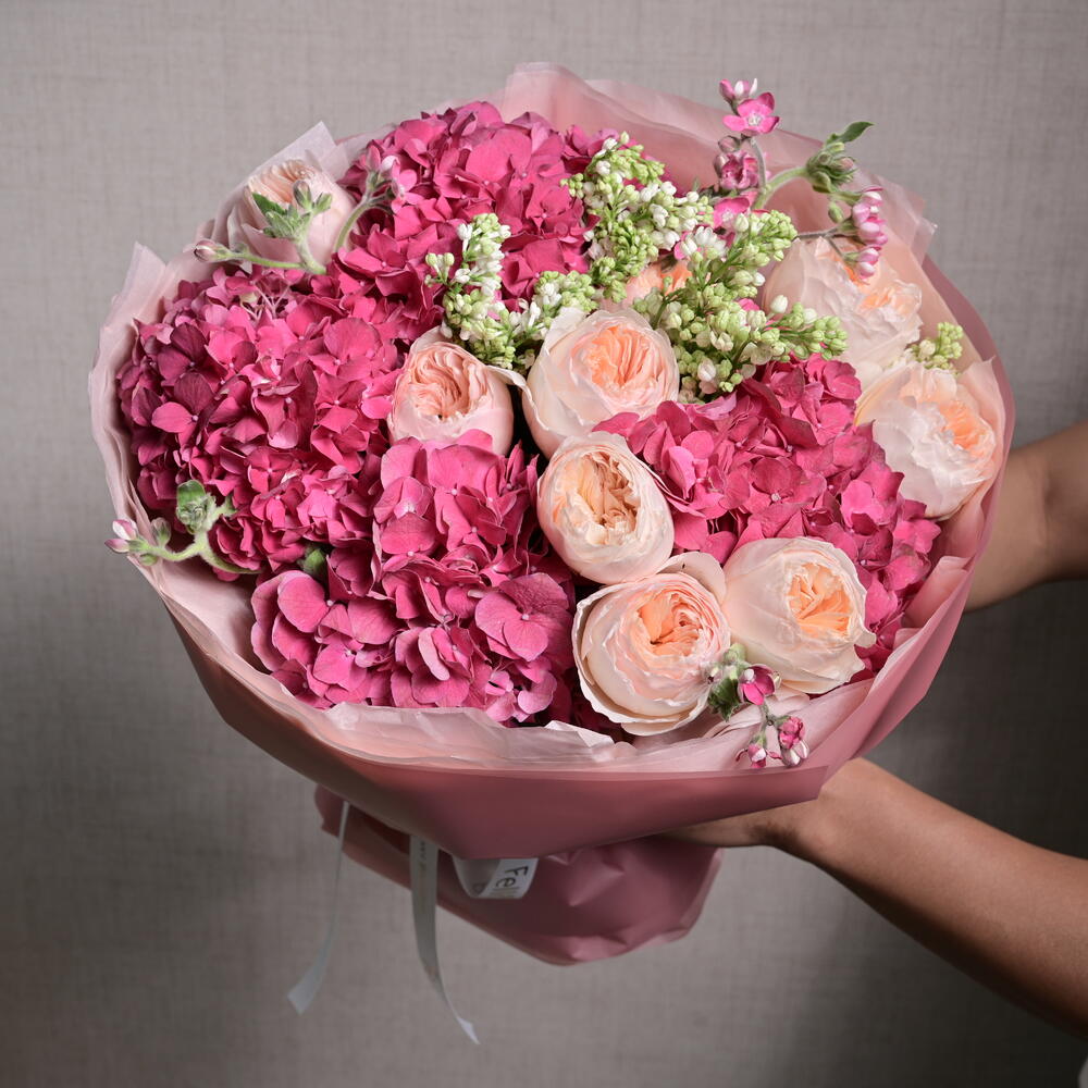 A stunning bouquet featuring a delicate blend of hydrangeas and David Austin roses, perfect for adding elegance and charm to any occasion. The soft tones of peach and pink will create a memorable impression.