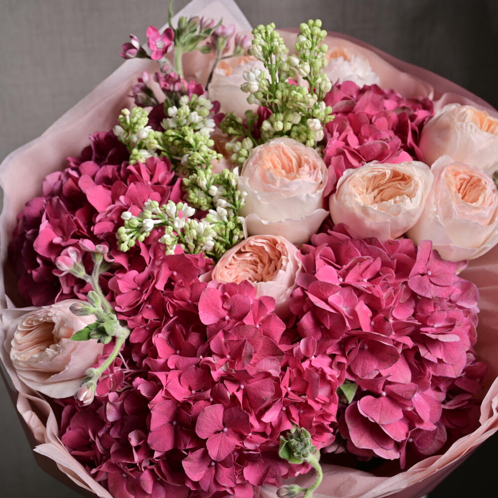 Ribbon - 1 pcs Hydrangea - 5 pcs wrapping paper - 5 pcs oxypetalum - 5 pcs syringa - 3 pcs david austin roses - 9 pcs