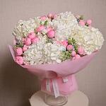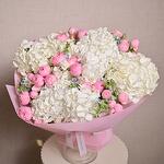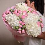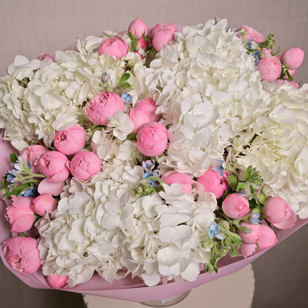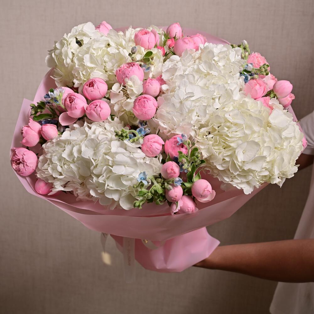The White Hydrangea and Peony Spray Roses Bouquet is a stunning floral arrangement that captures the essence of elegance and sophistication. Featuring the soft, delicate hues of white hydrangeas and pink peony spray roses, this bouquet is further complemented by the gentle blue accents of Oxypetalum.