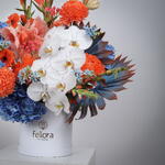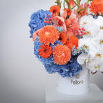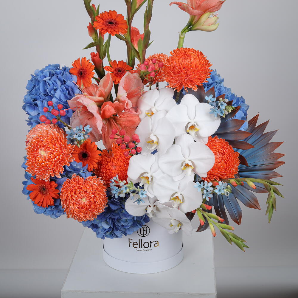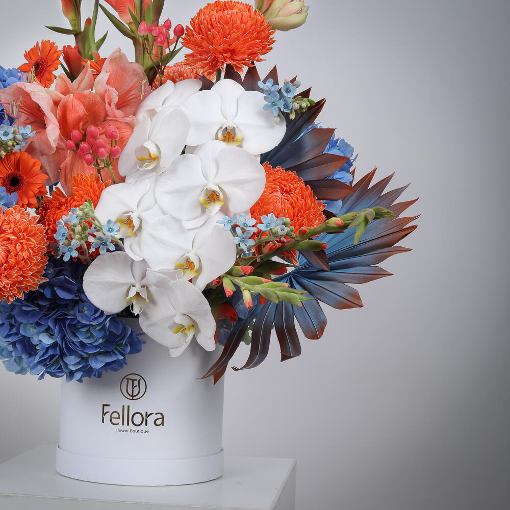 Hydrangea And Phalaenopsis Premium Flower Box is a luxurious floral symphony of elegance, vibrance, and design. This artfully crafted arrangement features a cascade of pristine white Phalaenopsis Orchids, bold orange Chrysanthemums, radiant Gladiolus, and soft Amaryllis, harmoniously paired with fresh Hydrangeas, playful Gerberas, delicate Oxypetalum, and blush Hypericum berries. Accented with glossy painted palm leaves, this exotic blend evokes both tropical sophistication and timeless charm, all beautifully arranged in a premium white Fellora signature hat box. Ideal for grand celebrations, luxury gifting, or as an opulent home centrepiece. We deliver across Dubai, Sharjah, and Ajman, bringing the beauty of our floral creations right to your doorstep.