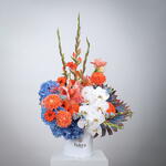 Hydrangea - 7 pcs Chrysanthemum - 5 pcs Gerbera - 5 pcs Phalaenopsis - 1 pcs hypericum - 5 pcs amaryllis - 2 pcs gladiolus - 5 pcs white box - 1 pcs oxypetalum - 5 pcs palm leaves - 2 pcs