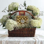 Eucalyptus - 3 pcs Basket - 1 pcs white hydrangea - 6 pcs ferrero rocher chocolate box of 24 pieces - 1 pcs mercy chocolate - 1 pcs gypdophelia - 4 pcs