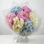 A luxurious mix of 3 pink, 2 blue, and 2 white hydrangeas arranged to create a premium pastel masterpiece.
