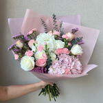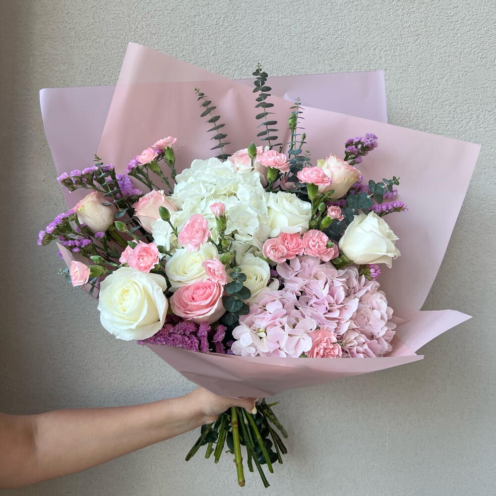 Statice - 4 pcs Pink rose - 5 pcs White rose - 5 pcs hydrangea pink - 1 pcs spray carnations - 3 pcs hydrangea white - 1 pcs eucalyptus leaves - 6 pcs