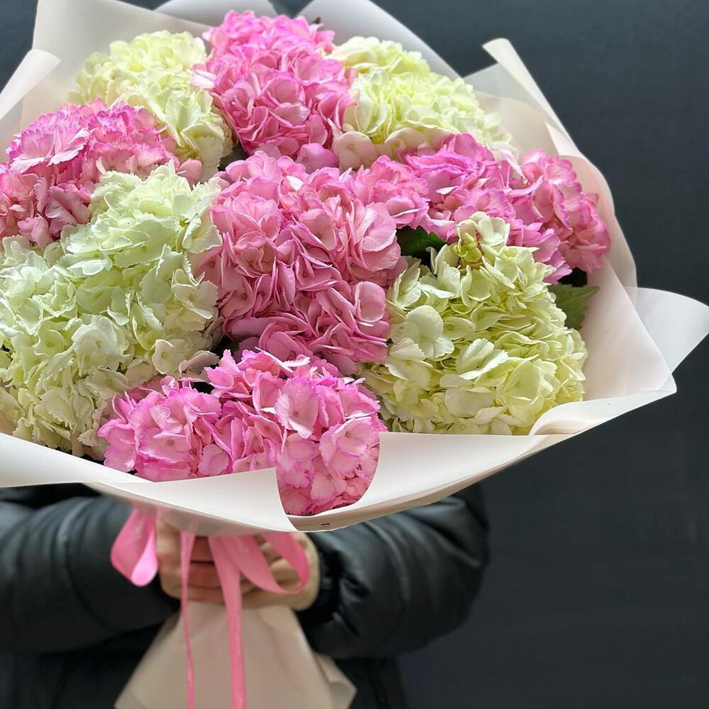 A captivating bouquet of white and pink hydrangeas combines elegance and charm in perfect harmony. The voluminous blooms of pure white hydrangeas exude serenity and grace, while the delicate pink hydrangeas add a touch of romance and warmth. Each blossom is artfully arranged, creating a lush, textured display that is both sophisticated and enchanting. This stunning bouquet, with its blend of soft hues and abundant petals, is an exquisite expression of beauty and affection, perfect for any special occasion.