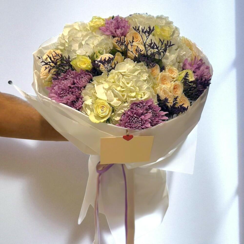 HYDRANGIA 3 SPERY ROSES 5 ROSES 5 CHRYSANTHIUM 5 CASPIA 2 IN A BQT 350 AED