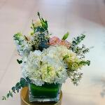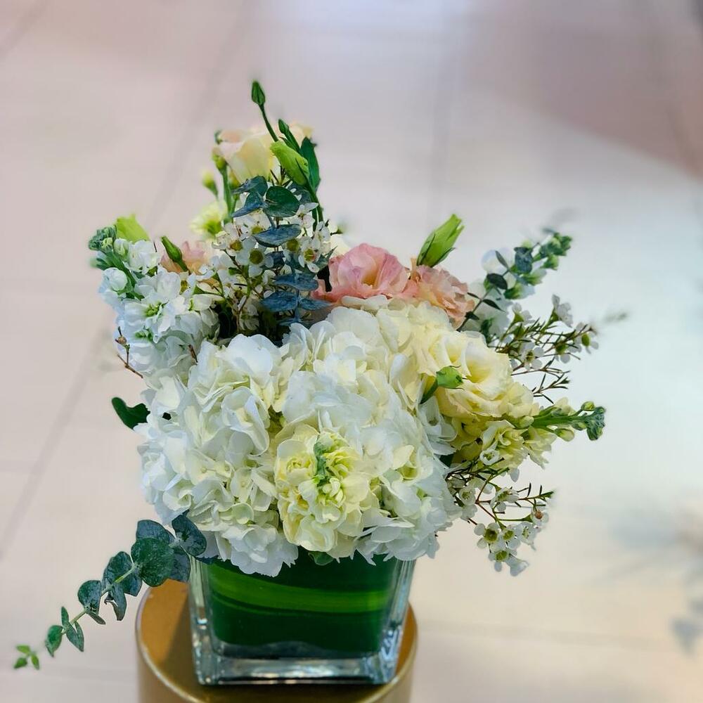 rose - 3 pcs wax - 3 pcs lisanthius - 3 pcs eucaley - 2 pcs hydrangia - 2 pcs 12 * 12 squr vase - 1 pcs