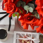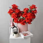 Red rose - 30 pcs eucalyptus leaves - 10 pcs scented candle - 1 pcs belgian chocolates - 16 pcs