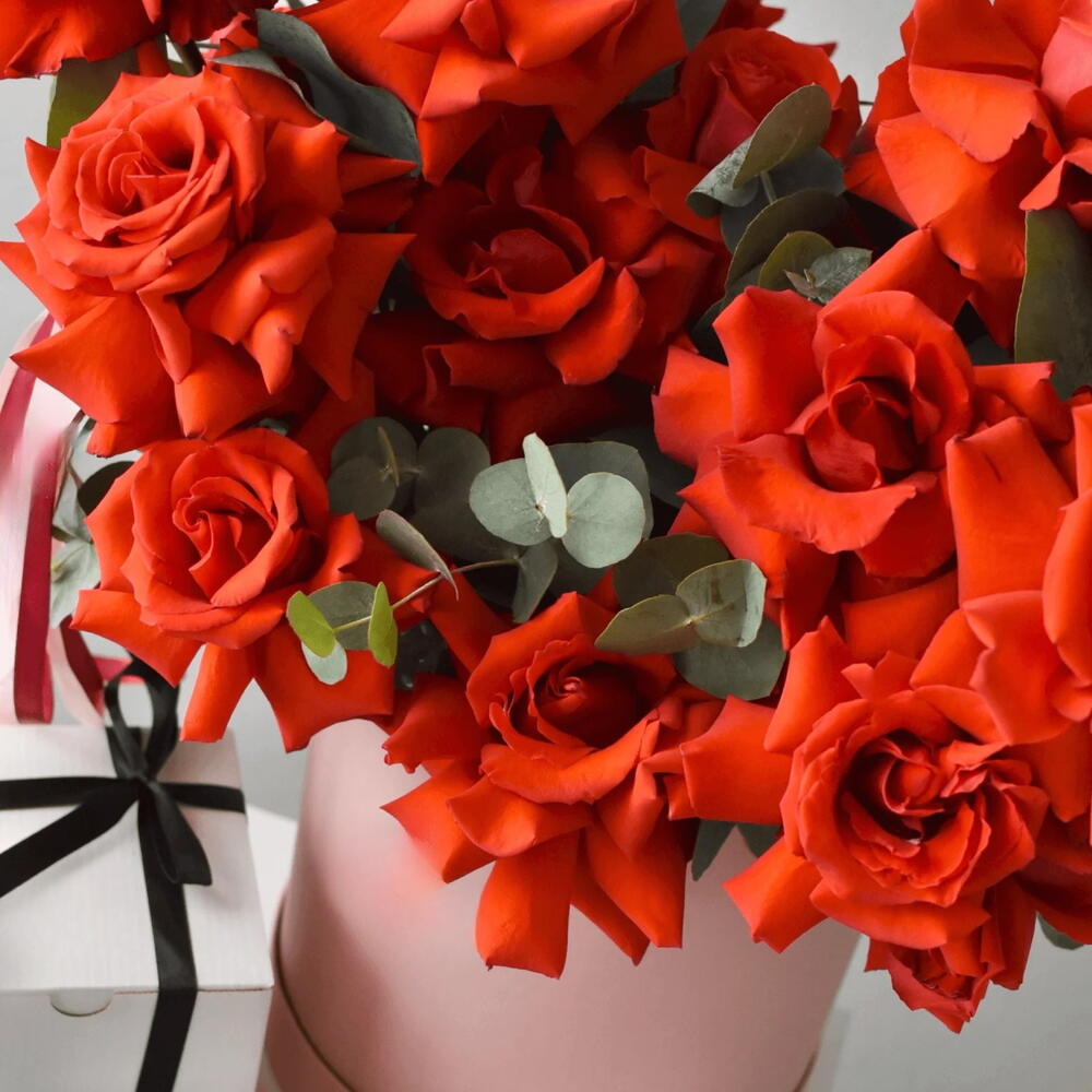Red rose - 30 pcs eucalyptus leaves - 10 pcs scented candle - 1 pcs belgian chocolates - 16 pcs