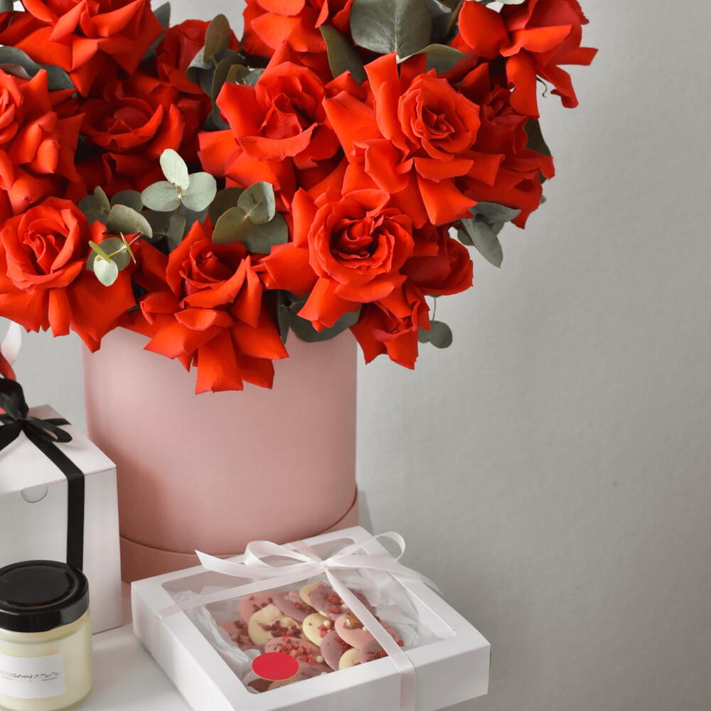 The I Love Gift Set is the perfect romantic gesture for the moments that matter. Designed to impress, this luxurious set features a stunning arrangement of fresh red roses beautifully presented in an elegant hat box — a timeless symbol of passion, love, and devotion. Each rose is selected for its rich color, velvety texture, and long-lasting freshness, creating a bouquet that feels bold, classic, and unforgettable. To elevate the experience, the gift set includes a premium Belgian chocolate box, offering smooth, indulgent flavors that complement the deep red blooms. Paired with a scented candle, this set becomes a complete sensory experience — warm, romantic, and thoughtfully curated for someone truly special. Ideal for anniversaries, birthdays, proposals, Valentine’s Day, or any occasion where you want your love to be felt, the I Love Gift Set combines elegance, sweetness, and luxury in one beautiful package. Perfect for gifting in the UAE, this set is designed for same-day delivery and makes the ultimate romantic surprise for her or him. Let your love speak beautifully — with roses, chocolate, and candlelight.
