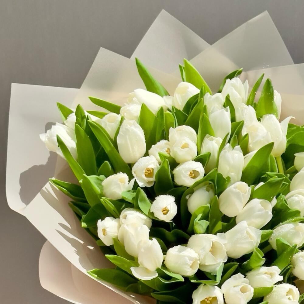 A luxurious bouquet of 51 pristine white tulips, symbolizing purity, grace, and timeless beauty. This exquisite arrangement is perfect for making a sophisticated and heartfelt statement.