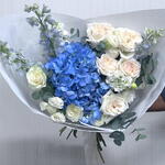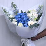 hydrangea blue - 1 pcs white ohara - 5 pcs eucalyptus leaves - 3 pcs mathiola white - 2 pcs lisanthus white - 3 pcs delphinium lblue - 3 pcs