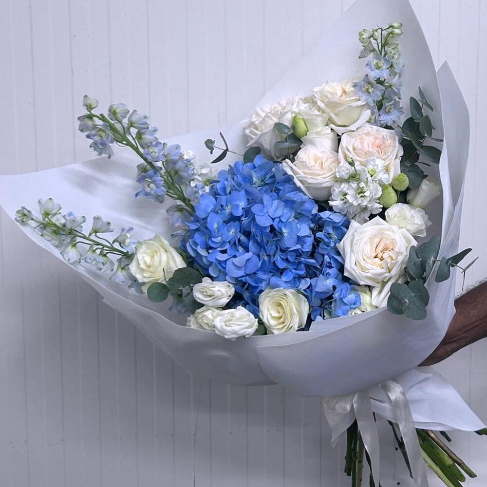 hydrangea blue - 1 pcs white ohara - 5 pcs eucalyptus leaves - 3 pcs mathiola white - 2 pcs lisanthus white - 3 pcs delphinium lblue - 3 pcs