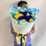 Yellow rose - 8 pcs ribbon satin - 1 pcs designer wrapping - 5 pcs tinted blue rose - 7 pcs