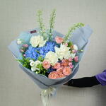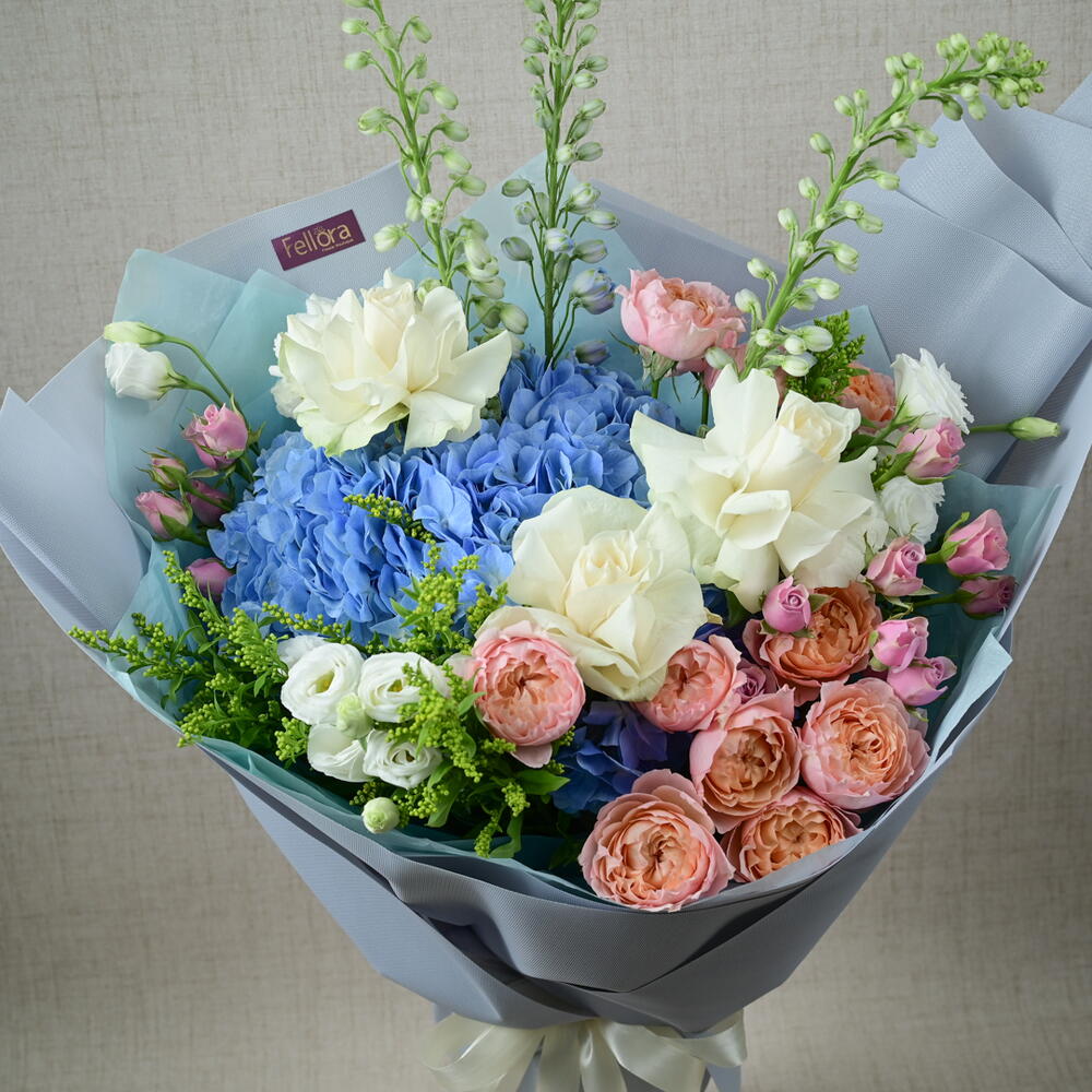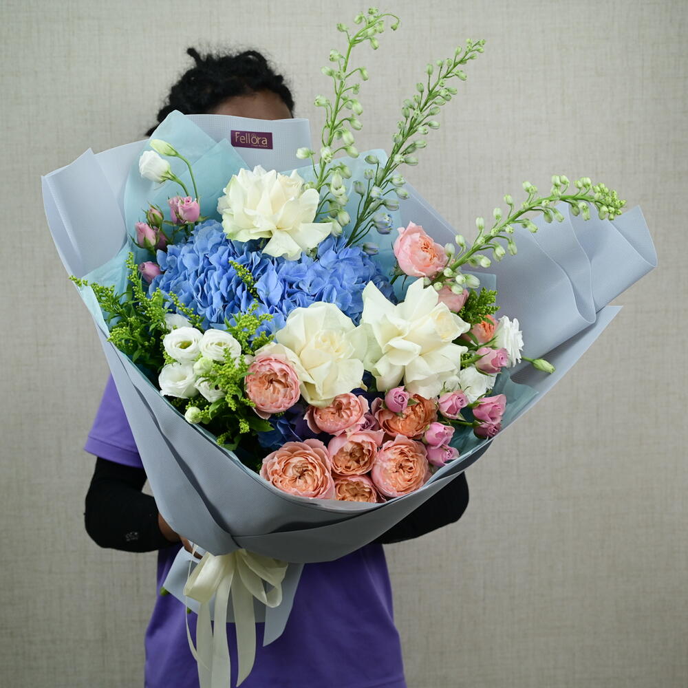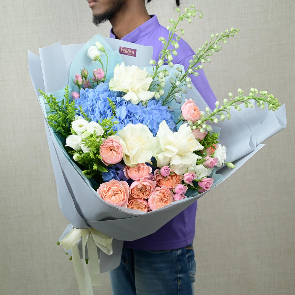Discover the refined beauty of our Into the Blue Bouquet, meticulously crafted by Fellora Flower Boutique Dubai. This stunning arrangement features an exquisite mix of premium blooms: 3 Stems of Delphinium Blue: Adding height and a vibrant splash of blue. 3 Stems of White Roses: Symbolizing purity and elegance. 3 Stems of White Lisianthus: Offering delicate charm and grace. 4 Stems of Julieta Premium Spray Peony Roses: Bringing a touch of luxury with their soft, lush petals. 2 Stems of Blue Hydrangea: Providing a rich, textured backdrop. 3 Stems of Solidago: Adding a touch of golden warmth. 3 Stems of Purple Spray Roses: Introducing a pop of color and sophistication. Dimensions: Height: 60 cm Width: 50 cm Perfect for any special occasion, celebration, or as a sophisticated gift, the Into the Blue Bouquet brings a harmonious blend of colors and textures to any setting. Let Fellora Flower Boutique Dubai deliver this exquisite floral masterpiece to your doorstep, enhancing your space with its timeless beauty. Why Choose the Into the Blue Bouquet? A carefully curated blend of premium flowers for a luxurious and elegant display. Ideal for making a refined statement at any event or as a sophisticated gift. Expertly arranged by our talented florists to ensure a stunning and cohesive design. Experience the elegance of the Into the Blue Bouquet from Fellora Flower Boutique Dubai. Order now and let us bring this beautiful floral creation to your home or event.