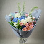 Ribbon - 1 pcs Solidago - 3 pcs white lisianthus - 3 pcs wrapping paper - 4 pcs hydrangia blue - 2 pcs white roses - 3 pcs purple spray roses - 3 pcs delphinium blue 3 - 3 pcs julieta premium spray peony roses - 4 pcs