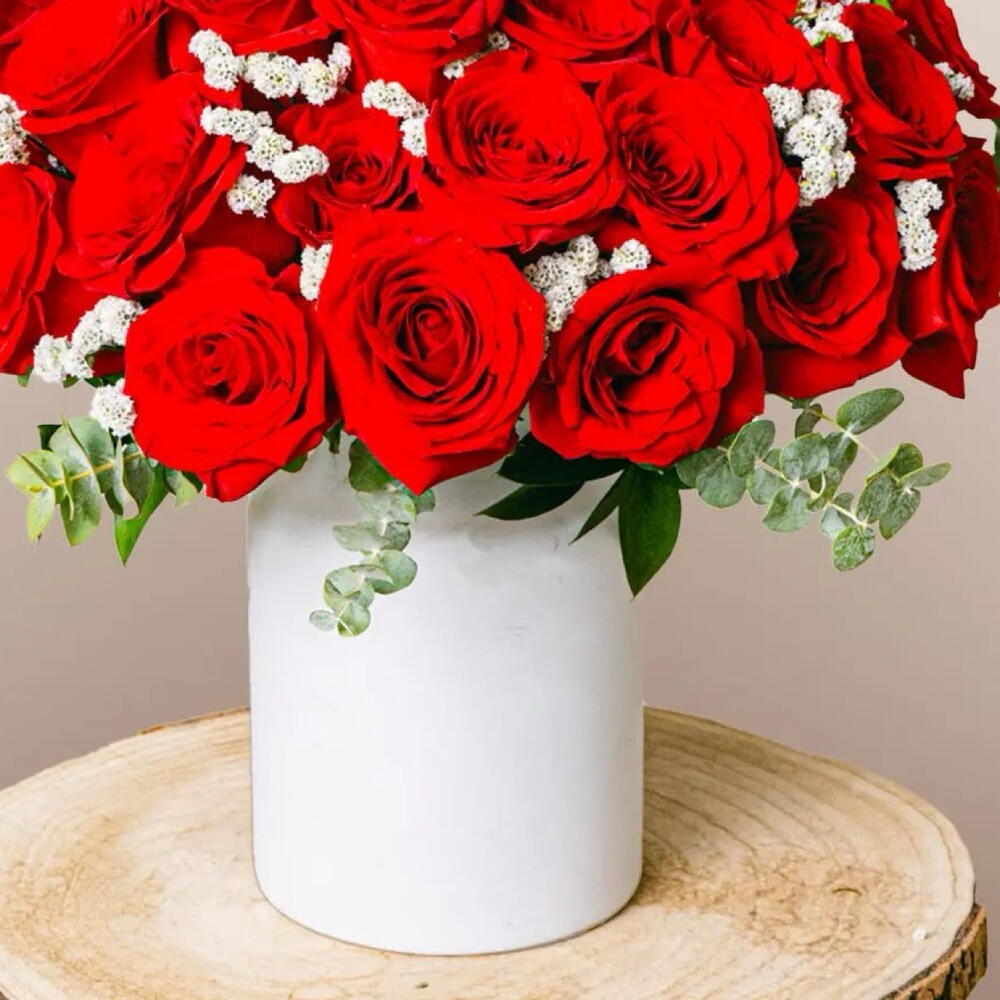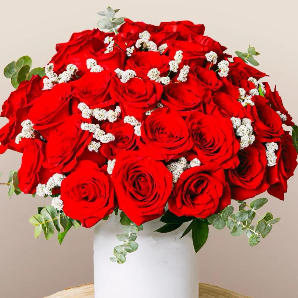 “Same-day available” Immerse yourself in the beauty of this lush flowers in a box arrangement. A stunning trio of three fresh eucalyptus stems sets a verdant stage for the ninety radiant red roses that twine splendidly among them. For an elegant finishing touch, we have nestled three delicate bunches of gypsophila amongst these vibrant blooms. Each element complements the others to create a floral masterpiece harmonising natural beauty and elegant sophistication. Exquisitely arranged and sure to impress at first sight, this box promises a whisper of luxury in every petal. ⚠️ IMPORTANT NOTES: • Some flowers may be substituted with other flowers according to availability • If the vase is sold out, it’ll be substituted with another similar one - Some of our flowers may arrive in bud, ready to bloom