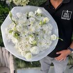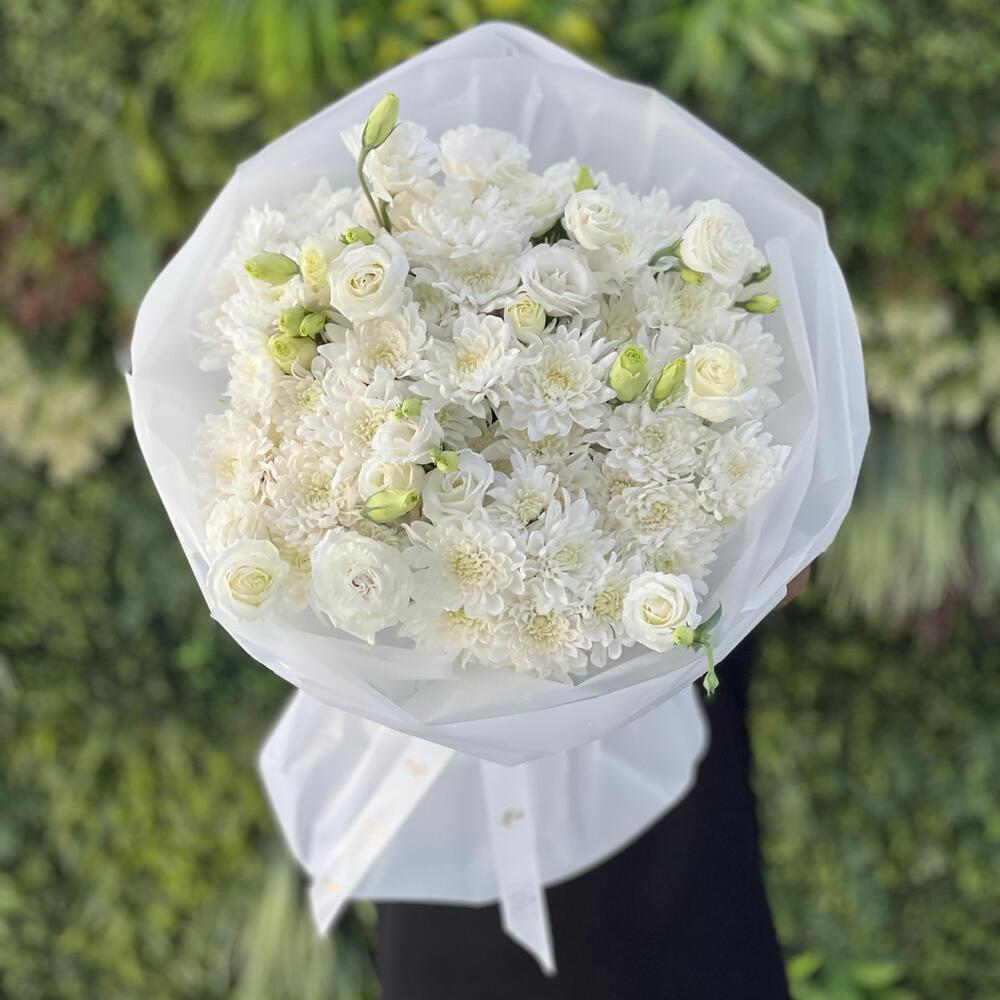 white chrysanthemum - 7 pcs white eustoma - 5 pcs white cover - 6 pcs