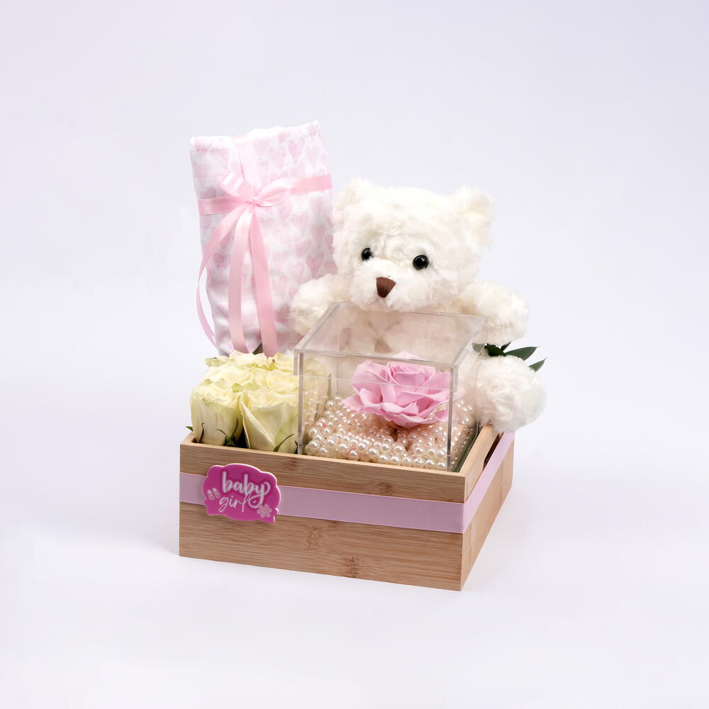 White rose - 6 pcs teddy - 1 pcs towel - 1 pcs forver rose pink with box tray - 1 pcs