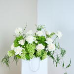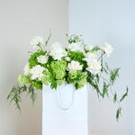 A timeless blend of pure white roses and lush green hydrangeas, this stunning arrangement exudes elegance and sophistication. The luxurious florals are artfully displayed in a chic white bag, adding a modern and stylish touch to any setting. Whether its a celebration, a gesture of love, or simply to bring a fresh breath of nature indoors, this arrangement is sure to captivate and uplift the spirit of any space. Delicate yet bold, it’s the perfect embodiment of grace and tranquillity. Gift Details: Viburnum Green Hydrangea Roses Lisanthius Asparagus Bag
