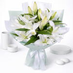 • 5 Premium Fresh Lily Stems • Elegant White Wrapping • Matching White Ribbon Finish • Expertly Handcrafted Bouquet Styling