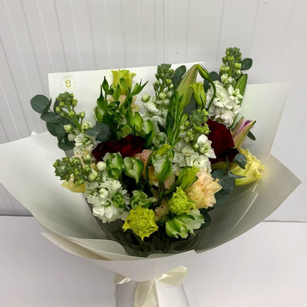 Red rose - 3 pcs wrapping paper - 5 pcs eucalyptus leaves - 3 pcs lily pink - 1 pcs mathiola white - 5 pcs lisanthus peach - 2 pcs