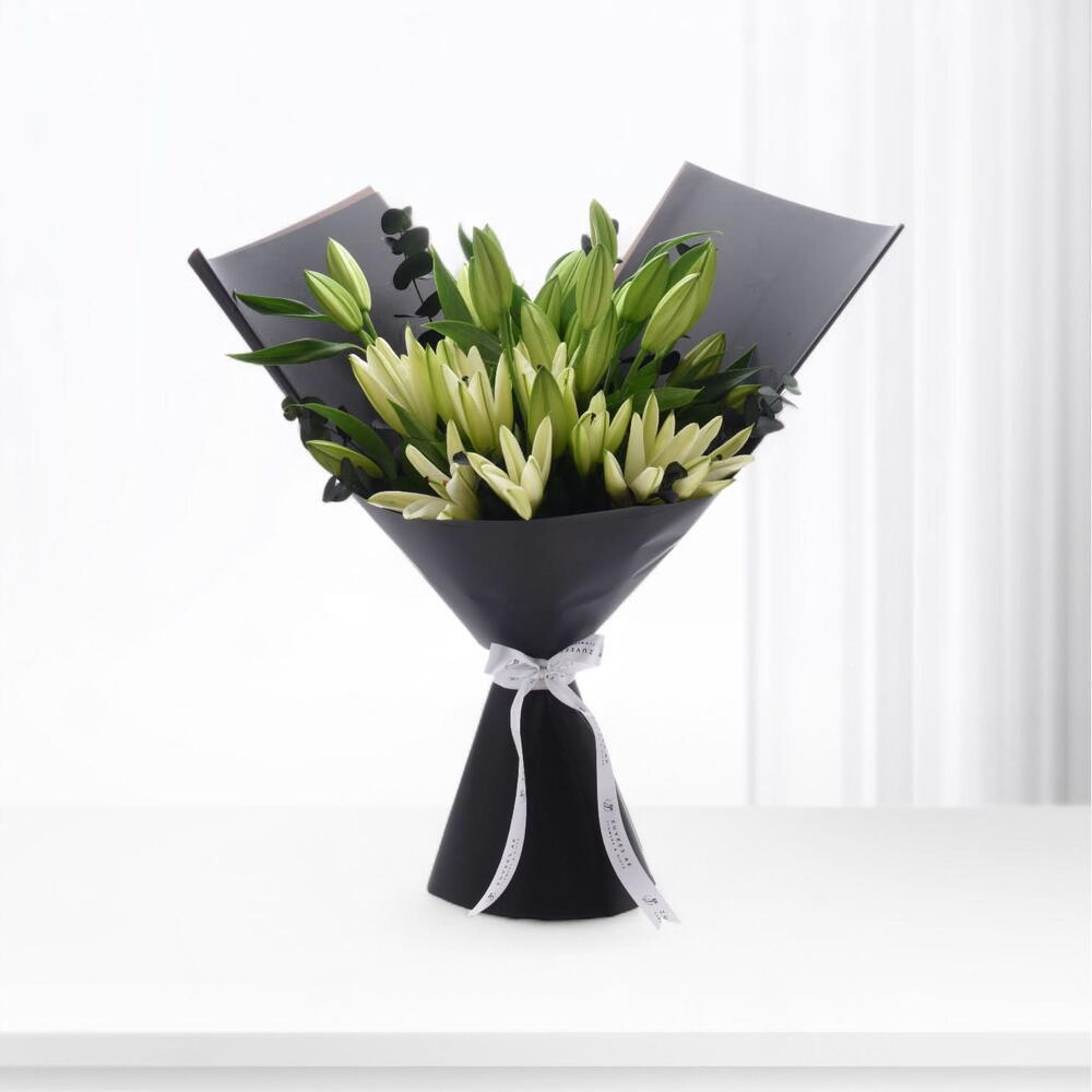 This immaculate Mono Bouquet is a perfect blend of bold and ethereal beauty. It features 10 majestic white lilies, artistically set amongst a backdrop of 6 stems of unique black eucalyptus, and 7 lush ruscus. The arrangement is handcrafted to perfection, exuding a timeless elegance and charm. Its more than just a bouquet; its a sensory experience that breathes a fresh, invigorating aura into any space. A great choice for those who appreciate the contemplative and meditative beauty of nature.